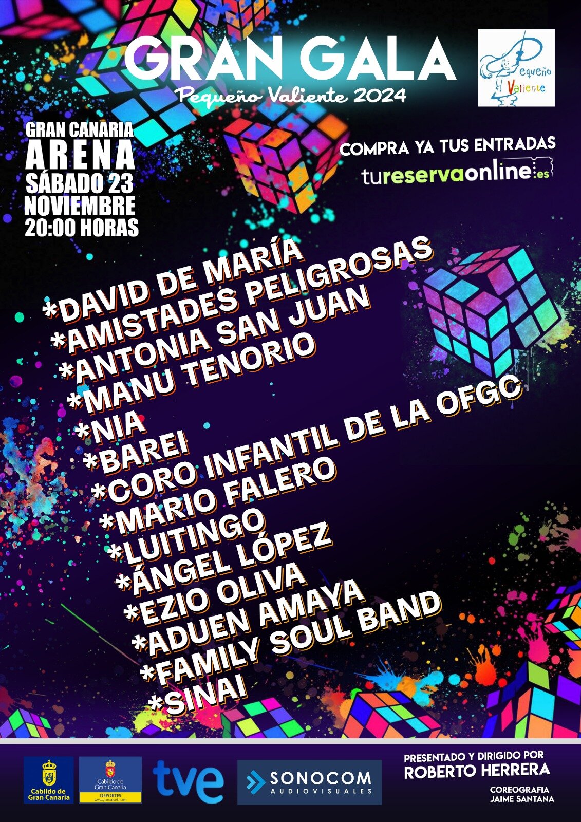 VII Edición de la Gran Gala Pequeño Valiente 2024 gracias al apoyo del Cabildo de Gran Canaria, RTVE y muchas otras empresas e instituciones públicas y privadas. Gracias a lo recaudado en este evento solidario se podrán seguir llevando a cabo grandes proyectos que mejoren la calidad de vida de todos/as los/as niños/as canarios/as enfermos de cáncer y sus familiares.